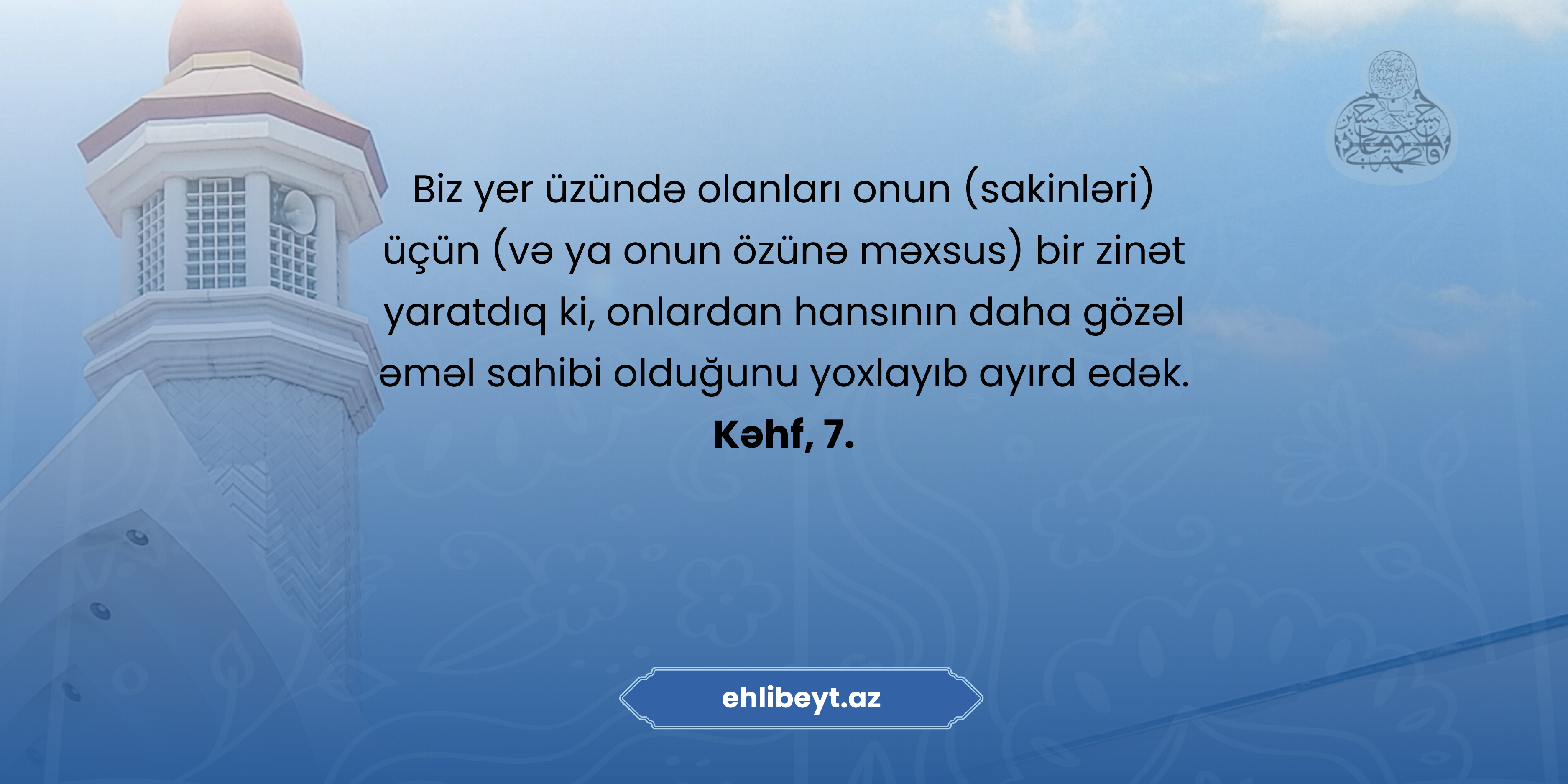İslamQuranKəhf, 7.FacebookTwitterPinterestWhatsApp Biz yer üzündə olanları onun (sakinləri) üçün (və ya onun özünə məxsus) bir zinət yaratdıq ki, onlardan hansının daha gözəl əməl sahibi olduğunu yoxlayıb ayırd edək. Kəhf, 7.